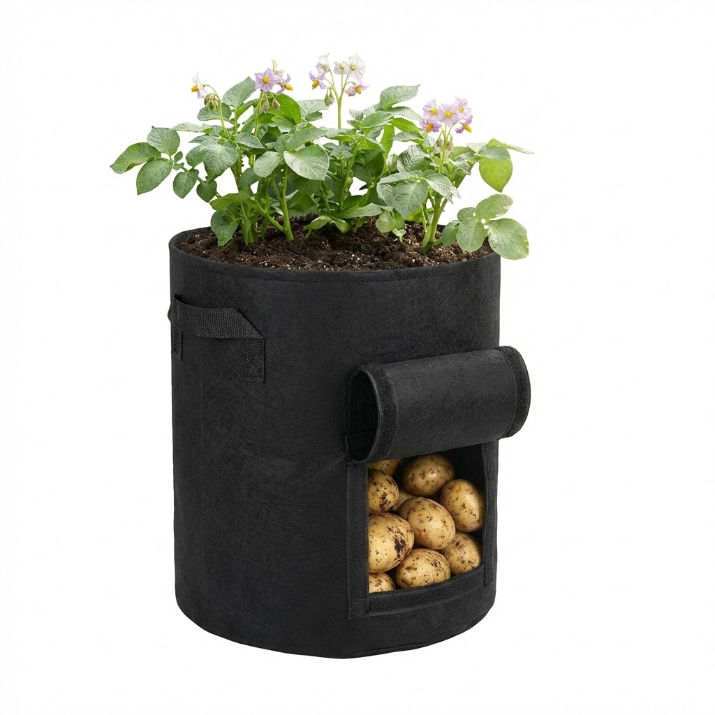 שק לגידול לתפוחי אדמה עם חלון מבד נושם בצבע שחור עם ידית נשיאה.